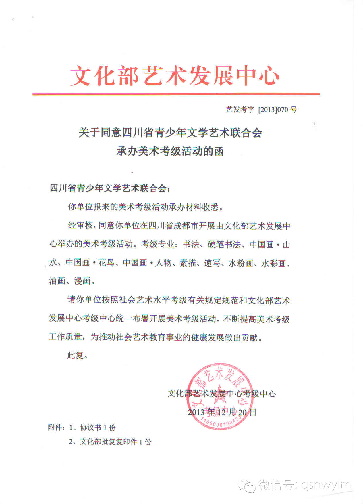 四川省青少年文联作为文化部艺术发展中心授权的社会艺术水平考级成都地区唯一承办单位(全国美术考级成都考区办公室设在省青少年文联内)。目前已经在双流艺体中学等三家学校设立全国美术考级定点单位。为方便考生,成都考区办公室还将在成都市设立更多定点机构。