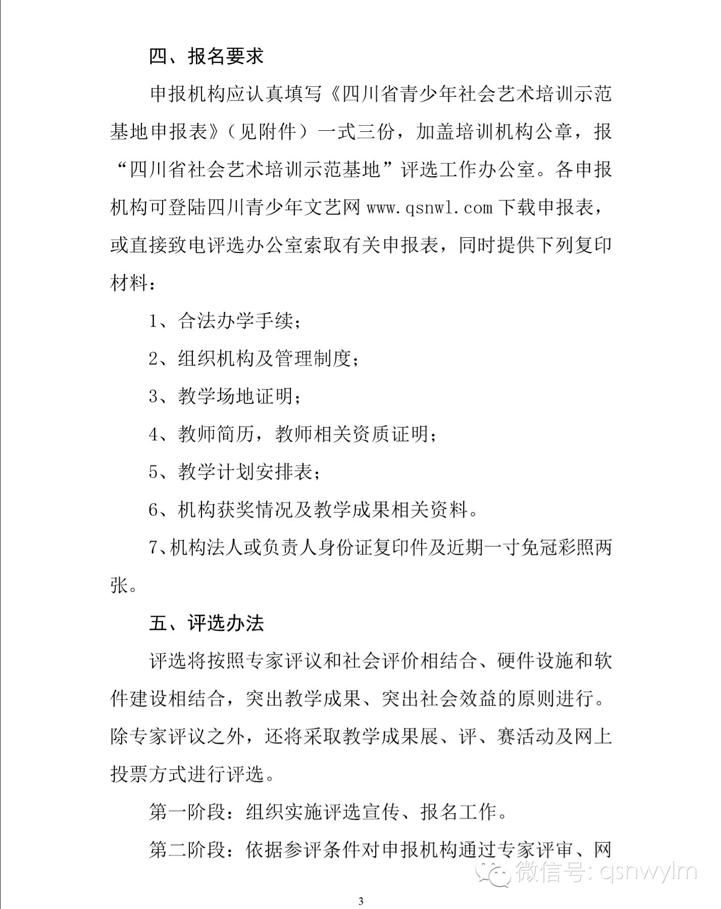 四、报名要求申报机构应认真填写《四川省青少年社会艺术培训示范基地申报表》(见附件)一式三份,加盖培训机构公章,报“四川省社会艺术培训示范基地”评选工作办公室。各申报机构可登陆四川青少年文艺网 www.qsnwl.com 下载申报表,或直接致电评选办公室索取有关申报表,同时提供下列复印材料:1、合法办学手续;2、组织机构及管理制度;3、教学场地证明;4、教师简历,教师相关资质证明;5、教学计划安排表;6、机构获奖情况及教学成果相关资料。7、机构法人或负责人身份证复印件及近期一寸免冠彩照两张。