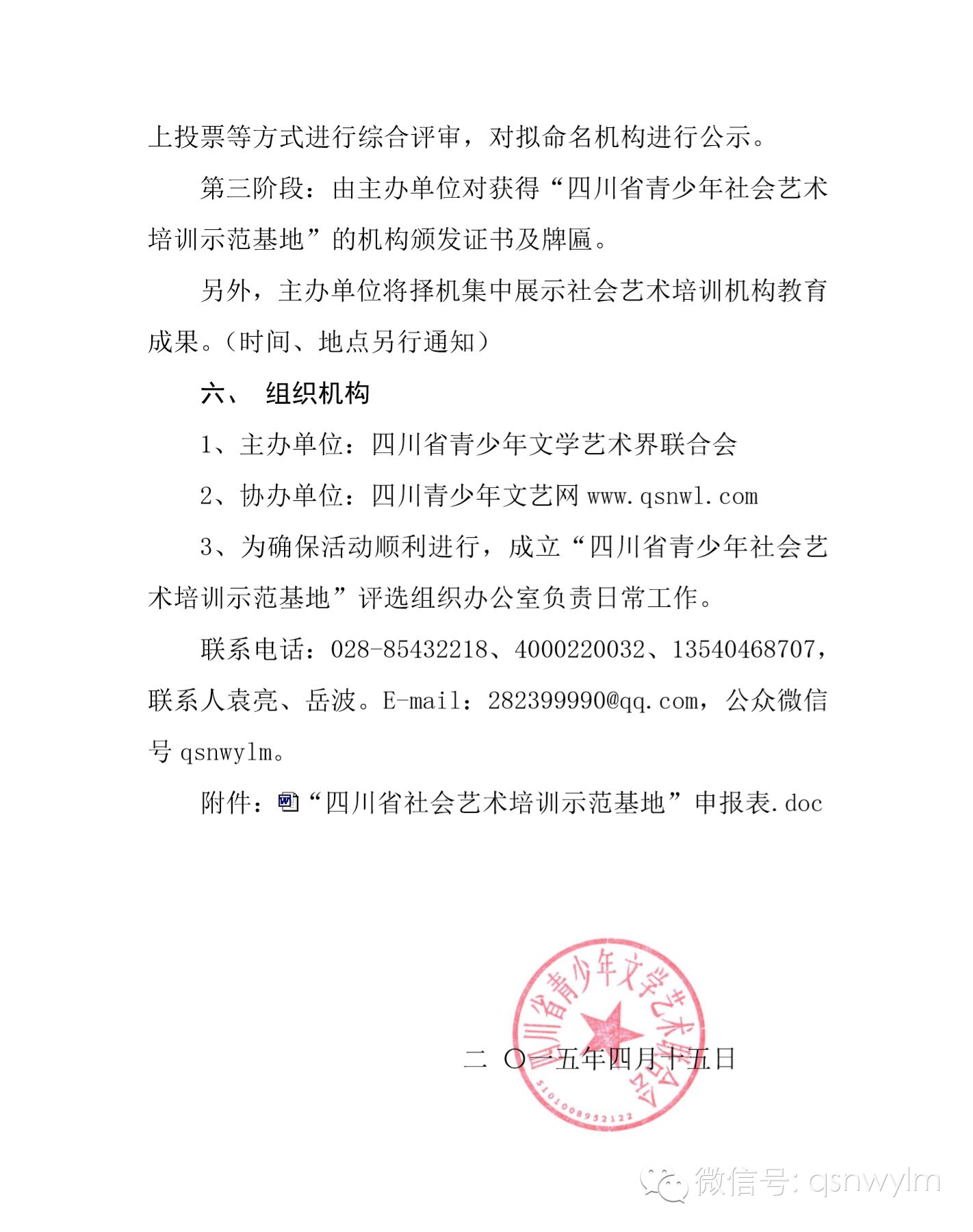 3、为确保活动顺利进行,成立“四川省青少年社会艺术培训示范基地”评选组织办公室负责日常工作。联系电话:028-85432218、4000220032、13540468707,联系人袁亮、岳波。E-mail:282399990@qq.com,公众微信号 qsnwylm。