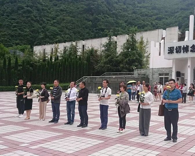 在漩口中学遗址前,我们一行每个人手捧鲜花,流着泪默哀!