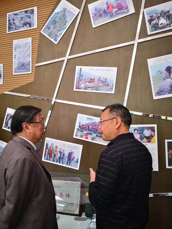 随后我们跟随熊校长参观了映秀小学。在这里我们见到了抗震英雄董雪峰校长,董校长现场送萧院长《一起重生》一书,董校长给我们介绍了映秀小学浴火重生的过程,带我们参观了映秀小学展览室。看到映秀小学震前老师们的合影,那张照片上有二十位年轻的生命已经永远定格在那灿烂而美丽的一刻。在场的每个人都满含泪水。