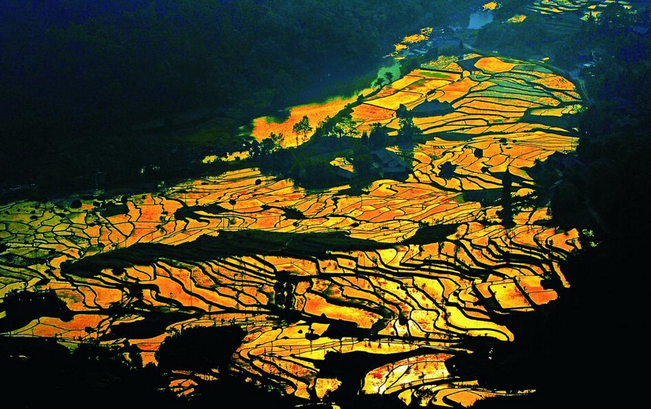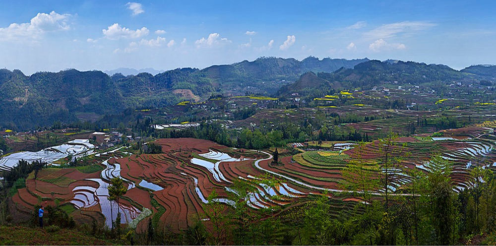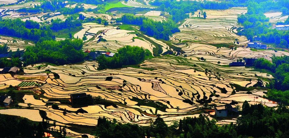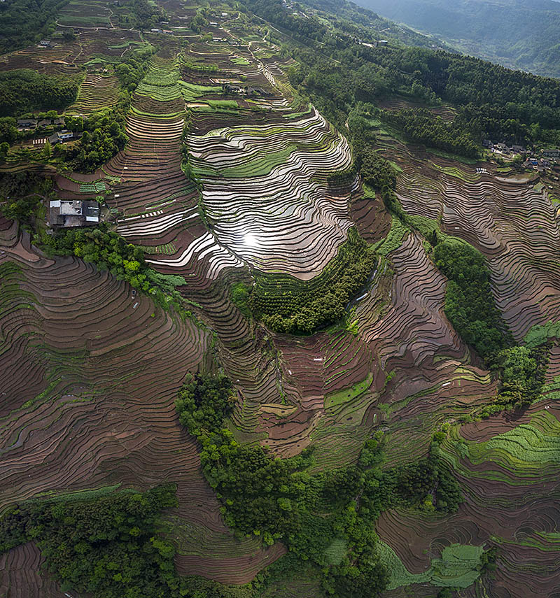 在有着僰人勤耕精神遗脉的宜宾市筠连县高坎乡,上万亩梯田气质恢宏,绝对是四川最美梯田的代表地之一。站在该乡的五星、红旗村的山岩边,片片梯田的线条如行云流水般婉约曼妙、潇洒飘逸,而梯田的形状又鳞次栉比、层出不穷。和着山风轻轻摇曳,纵横交错的梯田似乎在低吟着田园交响曲,让人仿佛置身天堂仙域,心旷神怡。梯田采用自上而下的灌溉系统,巧妙地利用陡峭山势为自然灌溉提供动力。欣赏梯田壮丽美景的同时,你更加会为这种崇尚自然的质朴智慧而心生感概。