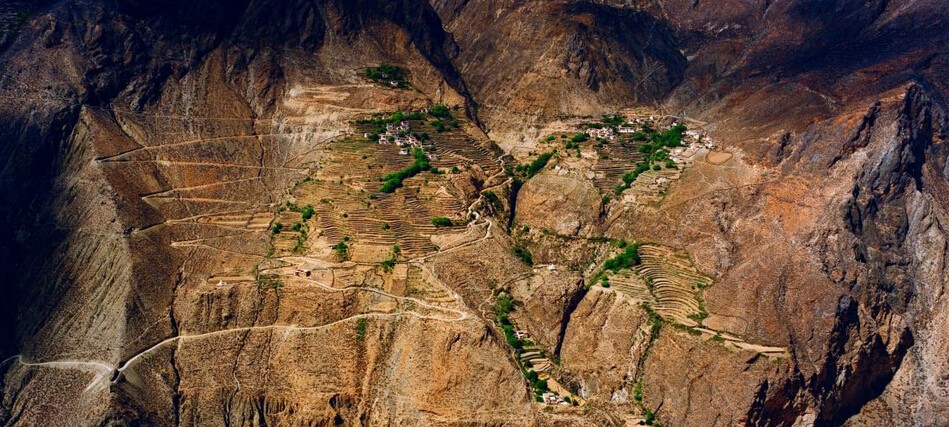 得荣藏语意为“峡谷之地”,在这里的干热河谷地带,座座藏寨依山而建,最为独特的要数古学乡日瓦村了。由于耕作土地极为贫乏,生活在这里的藏民在峡谷壁上开垦了狭窄的梯田。与汉族山区的梯田所不同的是,这里的梯田并没有层层反光的水面,干燥的河谷之上,靠人力凿出的条条耕地与这里的人一起,顽强地“挂”在峡谷两侧,构成的则是一幅人和自然博弈而相依的画卷,古老而苍劲。