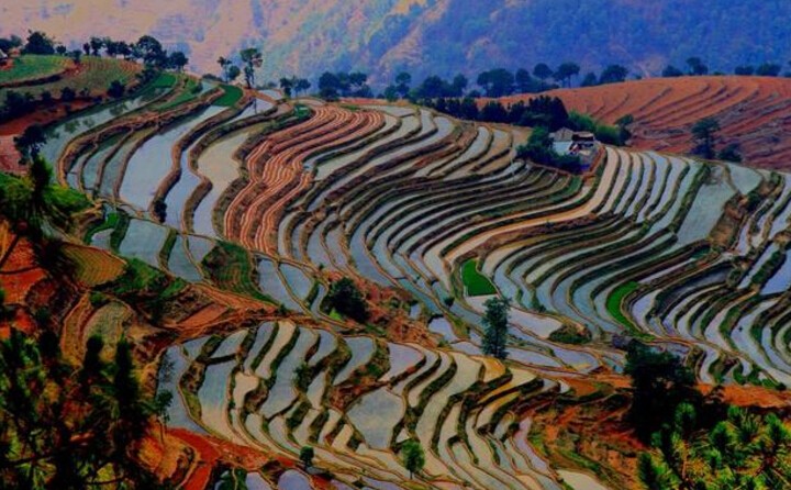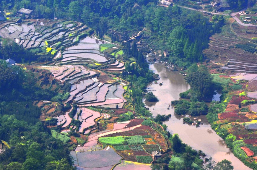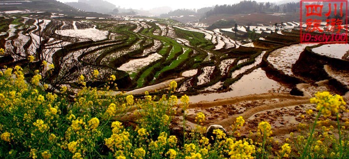 距离乐山不远的沙湾就有很多梯田,规模较大且相对集中,因地处山区,梯田依山而建,重重叠叠,看上去大有元阳梯田的韵律。由于土质中含有铁的成份,使梯田呈现出暗红的色彩。