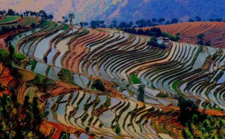 新山梯田位于攀枝花米易县内海拔3500米的龙肘山脚,这里是四川省最为集中的傈僳族聚居地。他们大多是在明、清时代从云南的丽江地区零星迁入四川境内。这里也有一片规模宏大的梯田群,其特色在于它完全处于原生态,是一颗“养在深闺人未识”的梯田风景明珠。伫立在山头眺望,成片的梯田随着山体的沟壑舒展起伏,人的心也会随之而飘散远去,回想古老的历史和传奇。