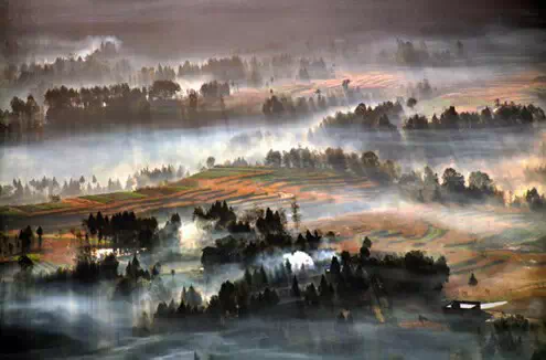 平昌县地处四川东部山区,属四川盆地外围大巴山山地。站在笔峰山上俯瞰,占地2000余亩的笔山梯田尽收眼底。波澜壮阔的梯田,将水的光泽、田的线条、村落的秀丽勾勒出流畅的明快曲线,让人仿佛置身于音乐家笔下的五线谱世界。在满坡满谷的雾气里,新鲜的泥土随着人和牛的移动如波浪般漫卷开来,伴着耳畔虫鸣鸟啁的唱和,恰如一首清新低吟的乡村小调。